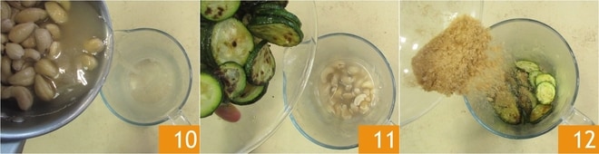 Une fois ramollies, versez les noix de cajou avec leur eau dans un récipient 10, puis ajoutez presque toutes les courgettes 11 et une cuillère de levure alimentaire 12.