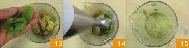 Ajoutez également quelques feuilles de menthe 13 et une pincée de sel et mixez avec un mixeur plongeant 14 jusqu'à obtenir une consistance crémeuse et homogène, en diluant si nécessaire avec un peu d'eau de cuisson des pâtes 15.