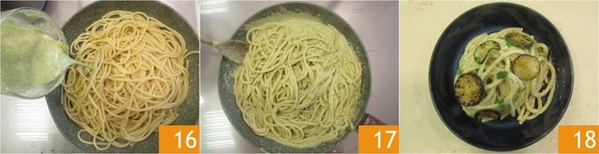Égouttez les bucatini al dente et transférez-les dans la même poêle où vous avez cuit les courgettes, puis ajoutez la crème 16 et une louche d'eau de cuisson. Faites sauter brièvement les pâtes pour les mélanger à la sauce, en ajoutant si nécessaire un peu plus d'eau de cuisson 17. Garnissez le plat avec les courgettes restantes, quelques feuilles de menthe et du zeste de citron râpé : vos bucatini crémeux aux courgettes et à la menthe sont prêts à être servis 18 !