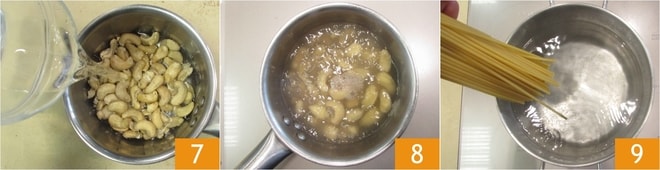 Entre-temps, mettez les noix de cajou dans une petite casserole et couvrez-les d'eau 7, puis mettez sur le feu et faites bouillir environ 5 minutes, juste le temps de les ramollir 8. Faites aussi cuire les bucatini dans de l'eau bouillante salée 9.
