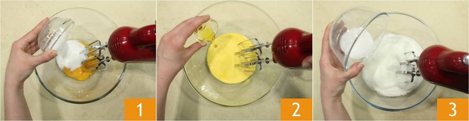 Pour préparer la bûche de Noël (Buche de Noel), commencez par la pâte biscuit : commencez par séparer les jaunes des blancs d'œufs. Battez les jaunes avec le fouet pendant quelques minutes avec 90 g de sucre 1, une pincée de sel, la vanille et le miel jusqu'à ce qu'ils deviennent clairs et très mousseux 2. Avec des fouets très propres, montez ensuite les blancs en neige avec le reste du sucre 3.