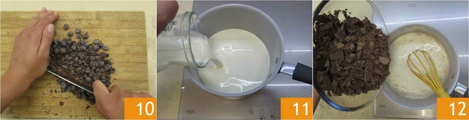 Entre-temps, passez à la ganache. Hachez le chocolat 10 ; versez la crème dans une casserole et portez-la à frôler l'ébullition 11. Quand la crème est chaude, éteignez et ajoutez le chocolat haché 12.