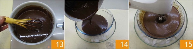 Mélangez avec le fouet pour le faire fondre complètement 13 puis transférez le mélange dans un bol placé à l'intérieur d'un autre bol plus grand avec de la glace 14. Maintenant commencez à monter avec un batteur électrique 15.