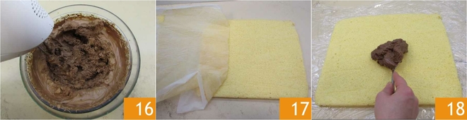 Travaillez la ganache pendant 10-15 minutes jusqu'à ce qu'elle soit bien montée, vous saurez qu'elle est prête quand la couleur deviendra similaire au chocolat au lait et sera plus ferme 16. Lorsque la pâte biscuit est froide, retirez le film plastique et détachez délicatement le papier sulfurisé 17, garnissez-la avec environ la moitié de la ganache montée 18.