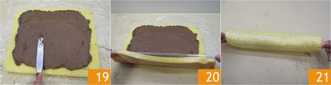 et répartissez-la en laissant 2 cm des bords 19. Roulez la pâte biscuit délicatement en vous aidant du film plastique 20, refermez les extrémités et placez le rouleau à raffermir au frigo pendant environ 1 heure avec le reste de la ganache 21.