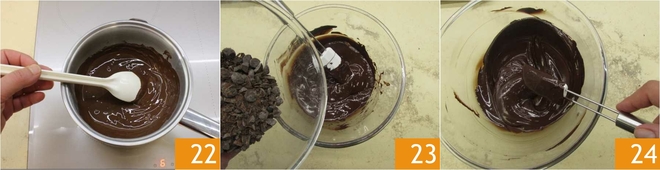 Pendant ce temps, occupez-vous de la décoration. Pour Comment faire le tempérage le chocolat avec la technique de l'ensemencement, il suffit de hacher le chocolat et de le diviser en deux parties : 2/3 et 1/3. Ensuite, versez dans une casserole pour bain-marie (ou au micro-ondes) 200g de chocolat noir haché 22, laissez-le fondre en mesurant la température du chocolat avec un thermomètre à pâtisserie, dès que le chocolat est fondu et a atteint la température de 45°, transférez immédiatement dans un bol et ajoutez les 100g restants de chocolat haché 23. Mélangez jusqu'à ce qu'il soit complètement amalgamé : mesurez encore la température qui doit atteindre 29°-31° 24.