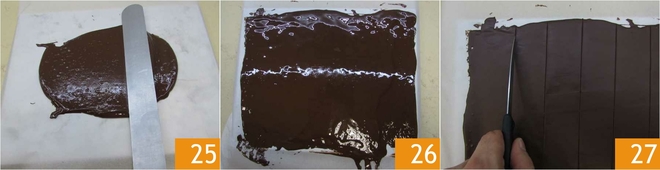 Transférez le chocolat sur une feuille de papier sulfurisé 25 étalez-le bien à l'aide d'une spatule pour former une fine plaque 26 et laissez refroidir, ainsi il durcira 26. Ensuite, vous pourrez le couper en bandes avec un couteau lisse puis en petits carrés 27.