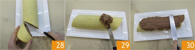 Récupérez le rouleau garni, égalisez les bords en coupant les deux extrémités (vous pouvez les consommer comme un goûter riche ou les placer sur les côtés, comme nous l'avons fait dans la bûche de Noël enneigée) 28. Étalez la ganache restante 29 jusqu'à recouvrir toute la bûche 30.