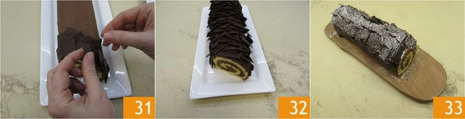 Pour finir, déposez les fines plaques côte à côte 31 pour recréer l'effet du tronc de bois 32. Une neige de sucre glace et votre bûche de Noël (Buche de Noel) est prête à être dégustée 33 !
