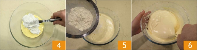 Maintenant, mélangez les deux préparations avec une spatule sans les démonter 4. Ajoutez la farine en la tamisant directement dans le bol 5, incorporez délicatement avec des mouvements de bas en haut 6.