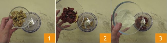 Pour préparer la bûche salée végétarienne, commencez par le pesto. Dans un mixeur, versez les cerneaux de noix 1, les tomates séchées pas trop égouttées 2 et le Pecorino râpé 3.