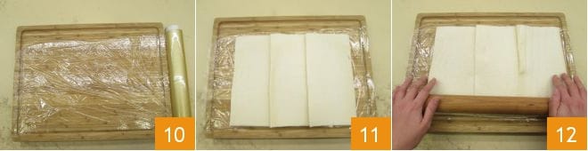 À ce stade, passez à la composition. Placez une feuille de film plastique sur la planche 10. Disposez 3 tranches de pain blanc en les superposant légèrement 11, puis aplatissez avec un rouleau à pâtisserie pour obtenir une seule tranche 12.