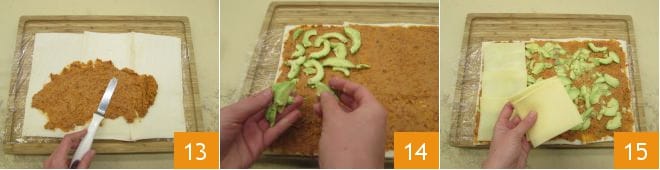 Étalez le pesto de tomates séchées uniformément sur toute la surface 13, puis disposez les tranches d'avocat 14 et l'édam en tranches 15.