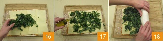 Enfin, répartissez le chou frisé 16 et garnissez de sel et d'huile 17 et passez à l'enroulement : serrez bien en commençant par le côté le plus court et obtenez ainsi un rouleau 18.