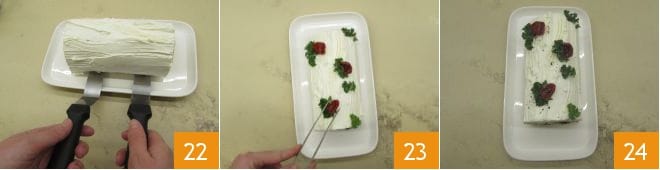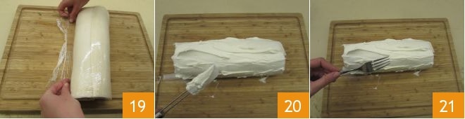 Enveloppez la bûche dans le film plastique 19 et laissez-la reposer au réfrigérateur pendant au moins une heure. Coupez les bords avant de garnir la surface avec un peu de fromage frais à tartiner 20. Puis, striez la surface avec les dents d'une fourchette, recréant ainsi l'aspect d'un tronc blanchi 21.