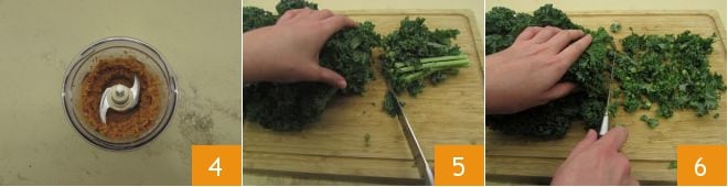 Actionnez les lames et obtenez une pâte, mettez-la un instant de côté 4. Passez au chou frisé. Après l'avoir bien rincé, séchez-le et enlevez les tiges avec un couteau 5. Hachez grossièrement les feuilles et mettez-les également de côté 6.