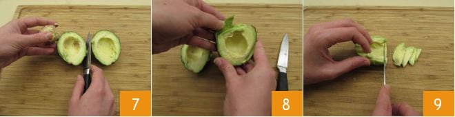 Enfin, nettoyez l'avocat. Coupez-le en deux, enlevez le noyau central 7 puis pelez-le. S'il est très mûr, il sera facile de détacher la chair de la peau, sinon vous pouvez passer une cuillère entre les deux 8. Coupez-le en fines tranches 9.