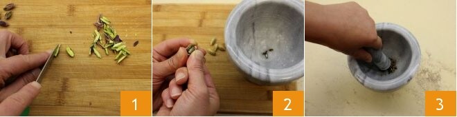 Pour préparer le pudding de riz au safran, coupez les pistaches 1 en lanières (gardez-en quelques-unes de côté car elles vous serviront pour la décoration), retirez la cardamome de sa coque 2 et écrasez le tout avec un mortier 3.