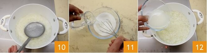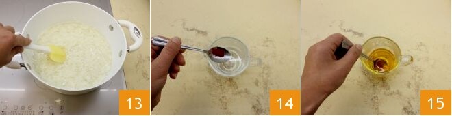 Éliminez l'éventuelle écume qui se formera pendant la cuisson 10. Mélangez 150 g d'eau avec le sucre en poudre 11 et versez le tout dans le riz 12.