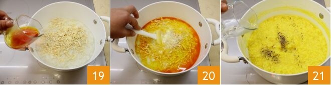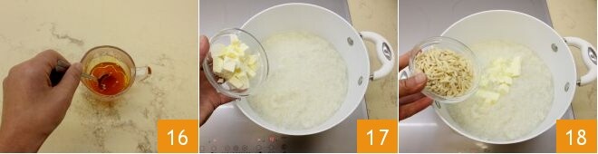 pour que le safran se dissolve 16. Ajoutez le beurre en morceaux dans le riz 17 et les amandes coupées en lanières (gardez-en quelques-unes pour la présentation finale) 18.