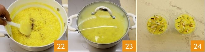 Mélangez le tout 22 et faites cuire encore 5 minutes, en couvrant avec un couvercle 23. Une fois prêt, versez le riz encore chaud dans 6 coupes de 9 cm de diamètre et 7 cm de hauteur. Décorez les coupes avec une pincée de cannelle, les amandes et les pistaches en lanières. Laissez-le au réfrigérateur pendant au moins 2 heures, après quoi vous pourrez servir et déguster votre pudding de riz au safran 24.