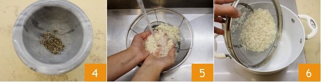 Une fois terminé 4, mettez de côté et occupez-vous du riz. Lavez-le sous abondante eau tiède 4 à 5 fois pour libérer l'amidon 5. Prenez une grande casserole et versez le riz 6