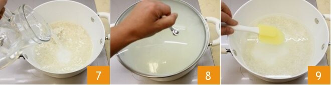 avec 500 g d'eau froide 7 et une pincée de sel. Portez le tout à ébullition puis baissez le feu. Faites cuire le riz 25 minutes en le couvrant avec un couvercle 8 et en remuant de temps en temps 9;