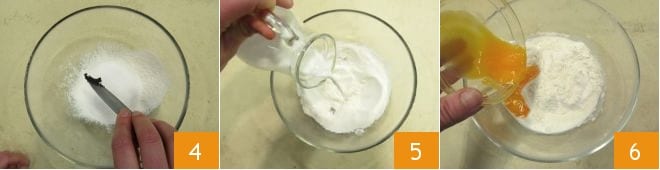 ajoutez également celles-ci aux ingrédients 4. Versez le lait 5 et les jaunes d'œufs 6.