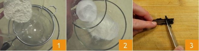 Pour réaliser les merveilles au cacao, commencez par préparer la crème : dans un bol, tamisez la fécule 1, ajoutez le sucre en poudre 2, puis incisez la gousse de vanille dans le sens de la longueur et à l'aide d'un petit couteau, extrayez-en les graines 3,