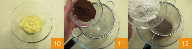 Transférez la crème dans un bol 10, laissez-la refroidir en la couvrant d'un film plastique au contact, une fois froide, placez-la au réfrigérateur pour qu'elle durcisse. Pendant ce temps, continuez avec la préparation de la pâte : dans un bol, tamisez le cacao en poudre 11, la farine 12