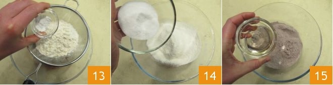 et la levure chimique pour gâteaux 13. Ajoutez ensuite le sucre en poudre 14 et mélangez toutes les poudres. Ajoutez maintenant aux ingrédients secs le vin blanc 15