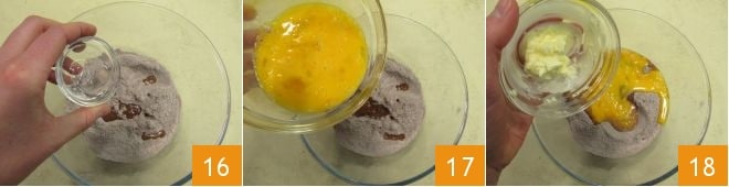 et la grappa 16. Puis ajoutez également les œufs battus 17, le beurre ramolli 18; mélangez avec une cuillère