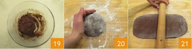 jusqu'à ce que la pâte soit homogène et souple 19 : cette consistance permettra aux deux couches de pâte d'adhérer mieux. Farinez le plan de travail et transférez la pâte, travaillez-la à la main pour obtenir une boule compacte 20 et puis étalez-la avec un rouleau à pâtisserie, vous devez obtenir une pâte d'environ 3-4 mm d'épaisseur 21.