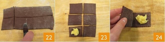 Avec une roulette dentelée, commencez à couper la pâte en carrés 22 (au total vous devez en obtenir 24 de 6 cm x 6 cm); vous pouvez retravailler l'excédent de pâte, l'étaler à nouveau et créer les carrés restants. Badigeonnez la moitié des carrés avec de l'eau, en humidifiant seulement les bords, puis prenez la crème désormais durcie et garnissez les carrés que vous avez badigeonnés avec un peu de crème au centre 23, refermez avec un autre carré de pâte 24