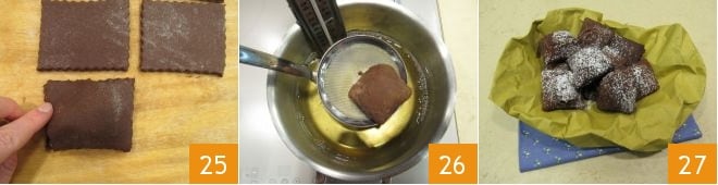 Pressez les bords avec les doigts pour bien faire adhérer les deux pâtes 25 et puis déposez les merveilles sur un plateau légèrement fariné. Continuez avec la farce jusqu'à épuisement des ingrédients. Maintenant, procédez à la cuisson : dans une casserole, chauffez l’huile de graines jusqu’à atteindre 175-180°C, pour une cuisson optimale, il est conseillé d’utiliser un thermomètre alimentaire pour vérifier la température de l’huile. À l’aide d’une écumoire, plongez quelques merveilles à la fois dans l’huile, environ deux 26, faites-les cuire pendant 3 minutes en les retournant pour obtenir une cuisson uniforme. Il est important de frire quelques pièces à la fois pour maintenir constante la température de l’huile. Une fois prêtes, égouttez les merveilles avec une écumoire et déposez-les sur un plateau recouvert de papier absorbant pour éliminer l’excès d’huile. Laissez refroidir les merveilles et saupoudrez-les à votre guise avec du sucre glace. Les merveilles au cacao farcies sont prêtes à être dégustées 27.