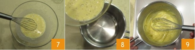 mélangez bien avec un fouet jusqu'à obtenir une préparation homogène 7. Transférez la crème dans une petite casserole 8 et portez-la au feu, dès qu'elle commence à bouillir, baissez le feu et mélangez avec le fouet jusqu'à obtenir une consistance épaisse 9. La crème doit être très épaisse, afin d'éviter qu'elle ne s'échappe des merveilles lors de la cuisson.