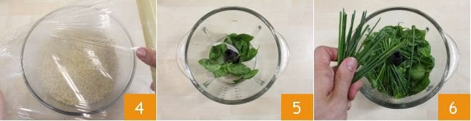 et couvrez-le avec du film alimentaire 4, laissez-le de côté jusqu'à ce qu'il tiédisse. Le boulgour aura ainsi doublé de volume. Consacrez-vous maintenant au pesto : prenez un mixeur (si vous préférez, vous pouvez aussi utiliser un mortier), mettez à l'intérieur les herbes aromatiques préalablement lavées et séchées : le basilic 5, les tiges de ciboulette 6,