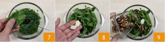 les feuilles de menthe 7, la gousse d’ail 8 (que vous pouvez aussi omettre si vous ne l'appréciez pas), les noix décortiquées 9