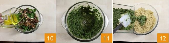 et ajoutez un filet d'huile 10, actionnez le mixeur et ajoutez progressivement suffisamment d'huile d'olive extra vierge pour obtenir une consistance presque veloutée 11. Assaisonnez avec du sel et transférez le pesto dans le bol contenant le boulgour en mélangeant pour que le boulgour s'imprègne du pesto aux herbes 12.