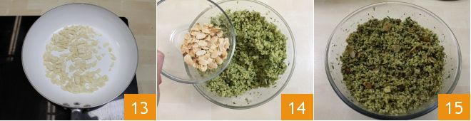 Maintenant, faites griller pendant quelques minutes les amandes dans une poêle chaude sans ajouter d'huile 13, en les retournant plusieurs fois pour éviter qu'elles ne brûlent. Ajoutez les amandes grillées au boulgour et mélangez pour obtenir un mélange homogène. Votre boulgour avec pesto aux herbes fraîches et noix est prêt à être dégusté !