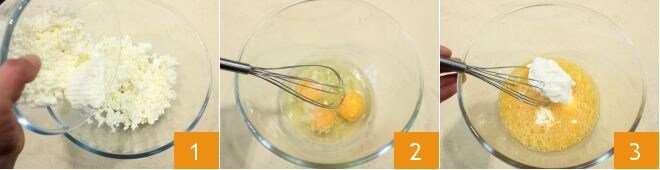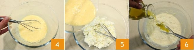 et mélangez avec le fouet pour l'incorporer 4, ajoutez le mélange d'œufs battus au skuta 5, mélangez le tout, puis enfin ajoutez l'huile d'olive en filet 6 en continuant à mélanger.