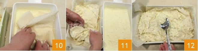 Prenez une autre feuille de pâte phyllo, essorez-la et plongez-la dans le bol contenant le mélange d'œufs et de fromage pour l'imprégner 10, puis étalez-la dans le plat 11. Continuez ainsi en immergeant les feuilles de pâte dans la garniture jusqu'à épuisement des ingrédients, en prenant soin de terminer par une couche de seule garniture répartie avec une cuillère sur la surface 12.