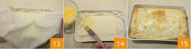 Recouvrez avec une feuille de pâte phyllo sèche à étaler sur la surface 13, repliez les bords vers l'intérieur pour refermer la pâte afin que la garniture ne s'échappe pas et badigeonnez toute la surface avec l'œuf battu 14. Faites cuire le burek au fromage dans un four statique à 180°C pendant 50 minutes (ou à 160°C dans un four ventilé pendant 40 minutes). Une fois la cuisson terminée, votre burek sera doré à la surface, sortez-le du four 15 et laissez-le tiédir avant de le servir.