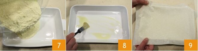 Transférez le mélange obtenu dans un grand bol 7, puis huilez un plat rectangulaire d'environ 30x20 cm 8, tapissez le fond avec une feuille de pâte phyllo en la laissant dépasser sur les bords car elle servira à refermer la pâte 9.