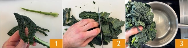 Pour préparer les burgers de chou noir et pois chiches, commencez par nettoyer le chou noir en séparant les tiges des feuilles 1, puis coupez grossièrement ces dernières 2. Mettez le chou noir dans une casserole d'eau bouillante salée 3.