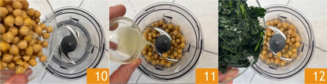 Dans un mixeur, mettez les pois chiches égouttés 10 et le jus de citron 11, puis ajoutez le chou noir 12.