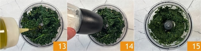 Ajoutez l'huile 13 et le sel 14, puis mixez pour obtenir une consistance assez grossière, pas parfaitement lisse 15.