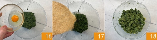 Transférez le mélange dans un bol, puis ajoutez l'œuf 16 et la chapelure, petit à petit 17. Mélangez avec une fourchette pour bien amalgamer le tout, en ajustant la quantité de chapelure en fonction de la consistance 18.