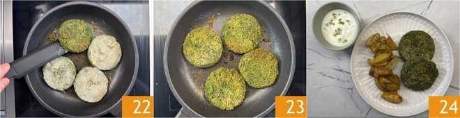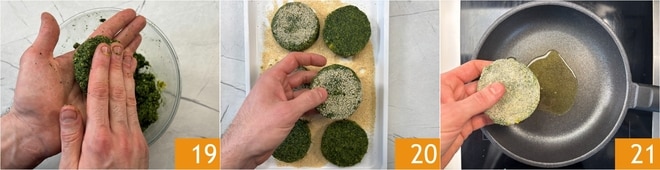 Formez les burgers en compactant et en aplatissant un peu du mélange dans le creux de la main 19; pour obtenir une forme plus précise, vous pouvez utiliser un verre ou un emporte-pièce. Avec ces doses, vous obtiendrez 6 burgers d'environ 9 cm de diamètre. Déposez-les au fur et à mesure sur un plateau recouvert de papier sulfurisé sur lequel vous aurez versé un peu plus de chapelure et recouvrez légèrement les deux côtés 20. Vous êtes prêt pour la cuisson : déposez les burgers dans une poêle antiadhésive dans laquelle vous aurez chauffé un filet d'huile 21.