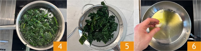 Faites cuire le chou noir pendant une dizaine de minutes 4, puis égouttez-le pour éliminer l'excès d'eau 5. Dans une poêle, faites revenir une gousse d'ail dans un filet d'huile 6.